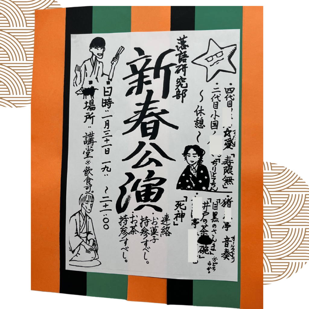 トップ > 新着情報一覧 > 学校生活 > 「落語研究部」 「落語研究部」 2026年2月12日 学校生活 2026年1月31日に寄席が開かれました。 名司会者と名噺家により、客席は笑いに溢れました。 「マクラ」「本題」「サゲ」も見事でありました 〜演目〜 「寿限無」 「ちりとてちん」 「井戸の茶碗」 「死神」 ◀ 「永遠なる今に生かされて」 後藤正寛 |